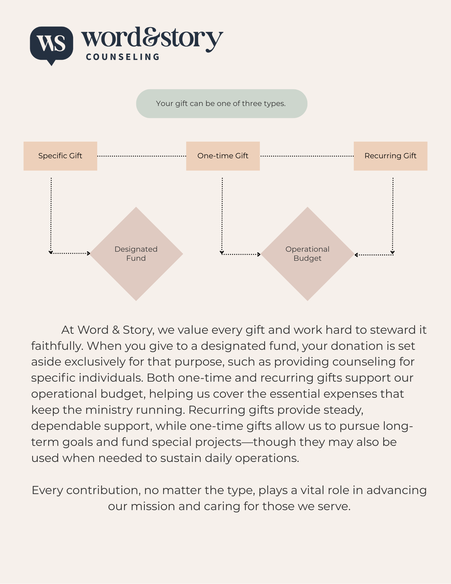 Word & Story uses donations in distinct ways to honor the intent of each gift. Contributions to designated funds are reserved exclusively for their specified purposes, such as supporting particular counselees. One-time gifts and recurring donations both flow into the organization’s operational budget, where they are applied to essential expenses that keep the ministry running. While recurring gifts provide steady support for ongoing needs, Word & Story seeks to use one-time gifts strategically to achieve long-term goals and fund special projects, though they may also be directed toward sustaining daily operations when necessary.